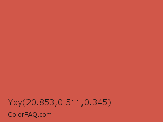 Yxy 20.853,0.511,0.345 Color is a normal red color and the nearest color is Dark Coral #cd5b45. Hex code #d15749 and RGB value is rgb(209,87,73). In RGB color space, this color is composed of 82% red, 34% green, 29% blue, In CMYK color space, this color is composed of 0% cyan, 58% magenta, 65% yellow , 18% black , In HSL color space, this color has a hue angle of 6° , 60% saturation and 55% lightness.