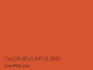 Yxy 20.85,0.547,0.363 Color is a normal red color and the nearest color is Flame Pea #da5b38. Hex code #d65430 and RGB value is rgb(214,84,48). In RGB color space, this color is composed of 84% red, 33% green, 19% blue, In CMYK color space, this color is composed of 0% cyan, 61% magenta, 78% yellow , 16% black , In HSL color space, this color has a hue angle of 13° , 67% saturation and 51% lightness.