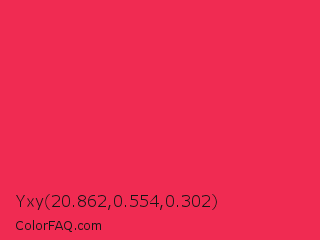 Yxy 20.862,0.554,0.302 Color is a normal red color and the nearest color is Amaranth #e52b50. Hex code #f02b52 and RGB value is rgb(240,43,82). In RGB color space, this color is composed of 94% red, 17% green, 32% blue, In CMYK color space, this color is composed of 0% cyan, 82% magenta, 66% yellow , 6% black , In HSL color space, this color has a hue angle of 348° , 87% saturation and 55% lightness.