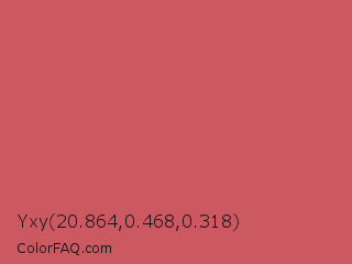 Yxy 20.864,0.468,0.318 Color is a normal red color and the nearest color is Chestnut Rose #cd5c5c. Hex code #cc5962 and RGB value is rgb(204,89,98). In RGB color space, this color is composed of 80% red, 35% green, 38% blue, In CMYK color space, this color is composed of 0% cyan, 56% magenta, 52% yellow , 20% black , In HSL color space, this color has a hue angle of 355° , 53% saturation and 57% lightness.