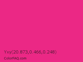 Yxy 20.873,0.466,0.248 Color is a normal rose color and the nearest color is Barbie Pink #e0218a. Hex code #eb2885 and RGB value is rgb(235,40,133). In RGB color space, this color is composed of 92% red, 16% green, 52% blue, In CMYK color space, this color is composed of 0% cyan, 83% magenta, 43% yellow , 8% black , In HSL color space, this color has a hue angle of 331° , 83% saturation and 54% lightness.