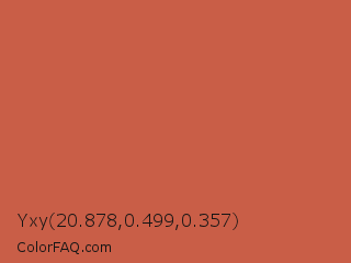 Yxy 20.878,0.499,0.357 Color is a normal red color and the nearest color is Cedar Chest #c95a49. Hex code #c95e47 and RGB value is rgb(201,94,71). In RGB color space, this color is composed of 79% red, 37% green, 28% blue, In CMYK color space, this color is composed of 0% cyan, 53% magenta, 65% yellow , 21% black , In HSL color space, this color has a hue angle of 11° , 55% saturation and 53% lightness.