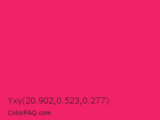 Yxy 20.902,0.523,0.277 Color is a normal rose color and the nearest color is Razzmatazz #e3256b. Hex code #f12268 and RGB value is rgb(241,34,104). In RGB color space, this color is composed of 95% red, 13% green, 41% blue, In CMYK color space, this color is composed of 0% cyan, 86% magenta, 57% yellow , 5% black , In HSL color space, this color has a hue angle of 340° , 88% saturation and 54% lightness.