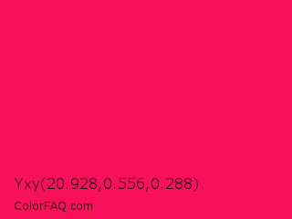 Yxy 20.928,0.556,0.288 Color is a normal rose color and the nearest color is Awesome #ff2052. Hex code #f71159 and RGB value is rgb(247,17,89). In RGB color space, this color is composed of 97% red, 7% green, 35% blue, In CMYK color space, this color is composed of 0% cyan, 93% magenta, 64% yellow , 3% black , In HSL color space, this color has a hue angle of 341° , 93% saturation and 52% lightness.