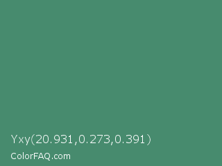 Yxy 20.931,0.273,0.391 Color is a normal green color and the nearest color is Viridian #40826d. Hex code #478b6e and RGB value is rgb(71,139,110). In RGB color space, this color is composed of 28% red, 55% green, 43% blue, In CMYK color space, this color is composed of 49% cyan, 0% magenta, 21% yellow , 45% black , In HSL color space, this color has a hue angle of 154° , 32% saturation and 41% lightness.