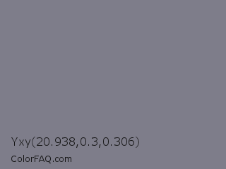 Yxy 20.938,0.3,0.306 Color is a normal indigo color and the nearest color is Topaz #7c778a. Hex code #7e7d8a and RGB value is rgb(126,125,138). In RGB color space, this color is composed of 49% red, 49% green, 54% blue, In CMYK color space, this color is composed of 9% cyan, 9% magenta, 0% yellow , 46% black , In HSL color space, this color has a hue angle of 245° , 5% saturation and 52% lightness.