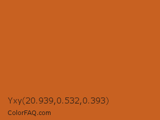 Yxy 20.939,0.532,0.393 Color is a normal orange color and the nearest color is Piper #c96323. Hex code #c86121 and RGB value is rgb(200,97,33). In RGB color space, this color is composed of 78% red, 38% green, 13% blue, In CMYK color space, this color is composed of 0% cyan, 52% magenta, 84% yellow , 22% black , In HSL color space, this color has a hue angle of 23° , 72% saturation and 46% lightness.