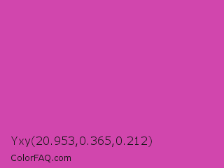 Yxy 20.953,0.365,0.212 Color is a normal magenta color and the nearest color is Pink Pantone #d74894. Hex code #d146ad and RGB value is rgb(209,70,173). In RGB color space, this color is composed of 82% red, 27% green, 68% blue, In CMYK color space, this color is composed of 0% cyan, 67% magenta, 17% yellow , 18% black , In HSL color space, this color has a hue angle of 316° , 60% saturation and 55% lightness.