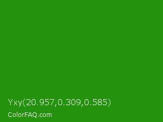 Yxy 20.957,0.309,0.585 Color is a normal green color and the nearest color is Slimy Green #299617. Hex code #24920c and RGB value is rgb(36,146,12). In RGB color space, this color is composed of 14% red, 57% green, 5% blue, In CMYK color space, this color is composed of 75% cyan, 0% magenta, 92% yellow , 43% black , In HSL color space, this color has a hue angle of 109° , 85% saturation and 31% lightness.