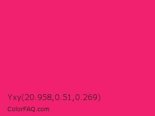 Yxy 20.958,0.51,0.269 Color is a normal rose color and the nearest color is Razzmatazz #e3256b. Hex code #f12170 and RGB value is rgb(241,33,112). In RGB color space, this color is composed of 95% red, 13% green, 44% blue, In CMYK color space, this color is composed of 0% cyan, 86% magenta, 54% yellow , 5% black , In HSL color space, this color has a hue angle of 337° , 88% saturation and 54% lightness.