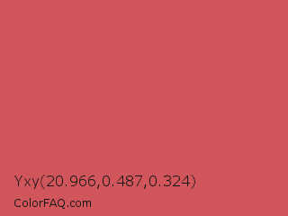 Yxy 20.966,0.487,0.324 Color is a normal red color and the nearest color is Chestnut Rose #cd5c5c. Hex code #d1565b and RGB value is rgb(209,86,91). In RGB color space, this color is composed of 82% red, 34% green, 36% blue, In CMYK color space, this color is composed of 0% cyan, 59% magenta, 56% yellow , 18% black , In HSL color space, this color has a hue angle of 358° , 57% saturation and 58% lightness.