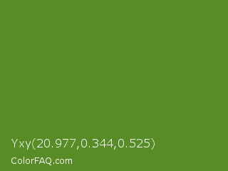 Yxy 20.977,0.344,0.525 Color is a normal green color and the nearest color is Maximum Green #5e8c31. Hex code #588c27 and RGB value is rgb(88,140,39). In RGB color space, this color is composed of 35% red, 55% green, 15% blue, In CMYK color space, this color is composed of 37% cyan, 0% magenta, 72% yellow , 45% black , In HSL color space, this color has a hue angle of 91° , 56% saturation and 35% lightness.