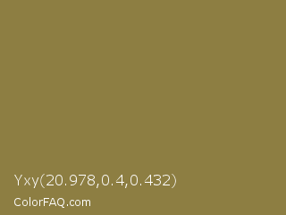 Yxy 20.978,0.4,0.432 Color is a normal yellow color and the nearest color is Old Moss Green #867e36. Hex code #8d7e42 and RGB value is rgb(141,126,66). In RGB color space, this color is composed of 55% red, 49% green, 26% blue, In CMYK color space, this color is composed of 0% cyan, 11% magenta, 53% yellow , 45% black , In HSL color space, this color has a hue angle of 48° , 36% saturation and 41% lightness.