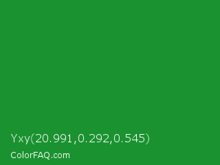 Yxy 20.991,0.292,0.545 Color is a normal green color and the nearest color is Forest Green #228b22. Hex code #1a9230 and RGB value is rgb(26,146,48). In RGB color space, this color is composed of 10% red, 57% green, 19% blue, In CMYK color space, this color is composed of 82% cyan, 0% magenta, 67% yellow , 43% black , In HSL color space, this color has a hue angle of 131° , 70% saturation and 34% lightness.