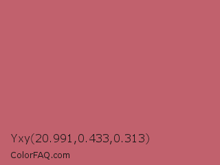 Yxy 20.991,0.433,0.313 Color is a normal red color and the nearest color is Fuzzy Wuzzy #cc6666. Hex code #c1616d and RGB value is rgb(193,97,109). In RGB color space, this color is composed of 76% red, 38% green, 43% blue, In CMYK color space, this color is composed of 0% cyan, 50% magenta, 44% yellow , 24% black , In HSL color space, this color has a hue angle of 353° , 44% saturation and 57% lightness.