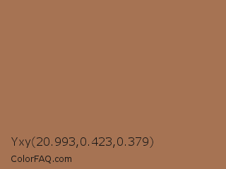 Yxy 20.993,0.423,0.379 Color is a normal orange color and the nearest color is Chamoisee #a0785a. Hex code #a67353 and RGB value is rgb(166,115,83). In RGB color space, this color is composed of 65% red, 45% green, 33% blue, In CMYK color space, this color is composed of 0% cyan, 31% magenta, 50% yellow , 35% black , In HSL color space, this color has a hue angle of 23° , 33% saturation and 49% lightness.
