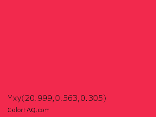Yxy 20.999,0.563,0.305 Color is a normal red color and the nearest color is Red Crayola #ee204d. Hex code #f2294d and RGB value is rgb(242,41,77). In RGB color space, this color is composed of 95% red, 16% green, 30% blue, In CMYK color space, this color is composed of 0% cyan, 83% magenta, 68% yellow , 5% black , In HSL color space, this color has a hue angle of 349° , 89% saturation and 55% lightness.
