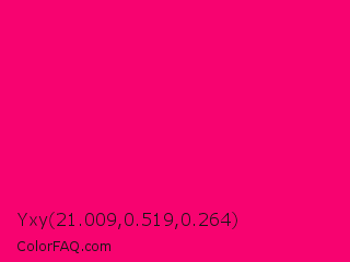 Yxy 21.009,0.519,0.264 Color is a normal rose color and the nearest color is Vivid Raspberry #ff006c. Hex code #f70370 and RGB value is rgb(247,3,112). In RGB color space, this color is composed of 97% red, 1% green, 44% blue, In CMYK color space, this color is composed of 0% cyan, 99% magenta, 55% yellow , 3% black , In HSL color space, this color has a hue angle of 333° , 98% saturation and 49% lightness.