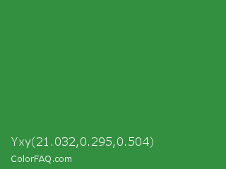 Yxy 21.032,0.295,0.504 Color is a normal green color and the nearest color is Sea Green #2e8b57. Hex code #349041 and RGB value is rgb(52,144,65). In RGB color space, this color is composed of 20% red, 56% green, 25% blue, In CMYK color space, this color is composed of 64% cyan, 0% magenta, 55% yellow , 44% black , In HSL color space, this color has a hue angle of 128° , 47% saturation and 38% lightness.