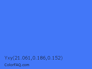 Yxy 21.061,0.186,0.152 Color is a light blue color and the nearest color is Ultramarine Blue #4166f5. Hex code #4277f8 and RGB value is rgb(66,119,248). In RGB color space, this color is composed of 26% red, 47% green, 97% blue, In CMYK color space, this color is composed of 73% cyan, 52% magenta, 0% yellow , 3% black , In HSL color space, this color has a hue angle of 223° , 93% saturation and 62% lightness.