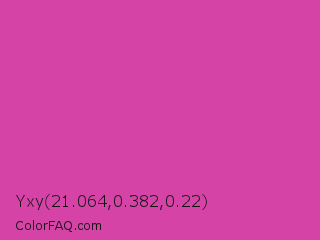 Yxy 21.064,0.382,0.22 Color is a normal magenta color and the nearest color is Pink Pantone #d74894. Hex code #d643a6 and RGB value is rgb(214,67,166). In RGB color space, this color is composed of 84% red, 26% green, 65% blue, In CMYK color space, this color is composed of 0% cyan, 69% magenta, 22% yellow , 16% black , In HSL color space, this color has a hue angle of 320° , 64% saturation and 55% lightness.