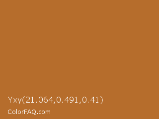 Yxy 21.064,0.491,0.41 Color is a normal orange color and the nearest color is Liver Dogs #b86d29. Hex code #b66d2c and RGB value is rgb(182,109,44). In RGB color space, this color is composed of 71% red, 43% green, 17% blue, In CMYK color space, this color is composed of 0% cyan, 40% magenta, 76% yellow , 29% black , In HSL color space, this color has a hue angle of 28° , 61% saturation and 44% lightness.