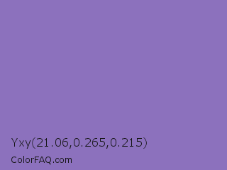 Yxy 21.06,0.265,0.215 Color is a normal violet color and the nearest color is Middle Blue Purple #8b72be. Hex code #8c71bd and RGB value is rgb(140,113,189). In RGB color space, this color is composed of 55% red, 44% green, 74% blue, In CMYK color space, this color is composed of 26% cyan, 40% magenta, 0% yellow , 26% black , In HSL color space, this color has a hue angle of 261° , 37% saturation and 59% lightness.