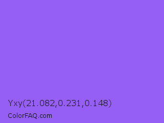 Yxy 21.082,0.231,0.148 Color is a light violet color and the nearest color is Navy Purple #9457eb. Hex code #955ff5 and RGB value is rgb(149,95,245). In RGB color space, this color is composed of 58% red, 37% green, 96% blue, In CMYK color space, this color is composed of 39% cyan, 61% magenta, 0% yellow , 4% black , In HSL color space, this color has a hue angle of 262° , 88% saturation and 67% lightness.