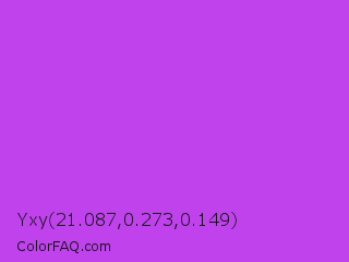 Yxy 21.087,0.273,0.149 Color is a normal purple color and the nearest color is Medium Orchid #ba55d3. Hex code #bf42ed and RGB value is rgb(191,66,237). In RGB color space, this color is composed of 75% red, 26% green, 93% blue, In CMYK color space, this color is composed of 19% cyan, 72% magenta, 0% yellow , 7% black , In HSL color space, this color has a hue angle of 284° , 83% saturation and 59% lightness.
