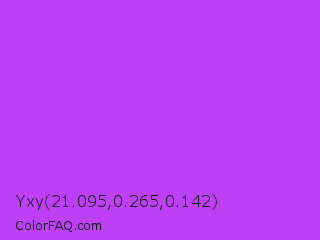 Yxy 21.095,0.265,0.142 Color is a light purple color and the nearest color is Medium Orchid #ba55d3. Hex code #be40f5 and RGB value is rgb(190,64,245). In RGB color space, this color is composed of 75% red, 25% green, 96% blue, In CMYK color space, this color is composed of 22% cyan, 74% magenta, 0% yellow , 4% black , In HSL color space, this color has a hue angle of 282° , 90% saturation and 61% lightness.