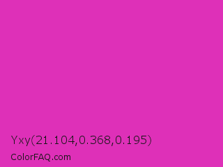 Yxy 21.104,0.368,0.195 Color is a normal magenta color and the nearest color is Frostbite #e936a7. Hex code #de30b8 and RGB value is rgb(222,48,184). In RGB color space, this color is composed of 87% red, 19% green, 72% blue, In CMYK color space, this color is composed of 0% cyan, 78% magenta, 17% yellow , 13% black , In HSL color space, this color has a hue angle of 313° , 73% saturation and 53% lightness.