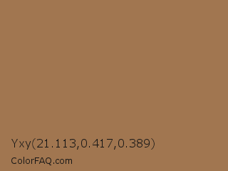 Yxy 21.113,0.417,0.389 Color is a normal orange color and the nearest color is Dirt #9b7653. Hex code #a17650 and RGB value is rgb(161,118,80). In RGB color space, this color is composed of 63% red, 46% green, 31% blue, In CMYK color space, this color is composed of 0% cyan, 27% magenta, 50% yellow , 37% black , In HSL color space, this color has a hue angle of 28° , 34% saturation and 47% lightness.