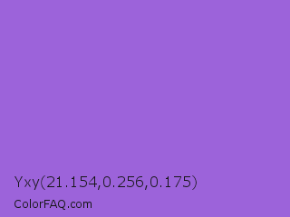 Yxy 21.154,0.256,0.175 Color is a light violet color and the nearest color is Dark Pastel Purple #966fd6. Hex code #9c63da and RGB value is rgb(156,99,218). In RGB color space, this color is composed of 61% red, 39% green, 85% blue, In CMYK color space, this color is composed of 28% cyan, 55% magenta, 0% yellow , 15% black , In HSL color space, this color has a hue angle of 269° , 62% saturation and 62% lightness.