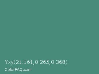 Yxy 21.161,0.265,0.368 Color is a normal green color and the nearest color is Viridian #40826d. Hex code #478b78 and RGB value is rgb(71,139,120). In RGB color space, this color is composed of 28% red, 55% green, 47% blue, In CMYK color space, this color is composed of 49% cyan, 0% magenta, 14% yellow , 45% black , In HSL color space, this color has a hue angle of 163° , 32% saturation and 41% lightness.