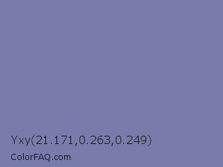 Yxy 21.171,0.263,0.249 Color is a normal blue color and the nearest color is Shadow Blue #778ba5. Hex code #797bab and RGB value is rgb(121,123,171). In RGB color space, this color is composed of 47% red, 48% green, 67% blue, In CMYK color space, this color is composed of 29% cyan, 28% magenta, 0% yellow , 33% black , In HSL color space, this color has a hue angle of 238° , 23% saturation and 57% lightness.