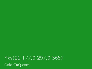 Yxy 21.177,0.297,0.565 Color is a normal green color and the nearest color is Forest Green #228b22. Hex code #189324 and RGB value is rgb(24,147,36). In RGB color space, this color is composed of 9% red, 58% green, 14% blue, In CMYK color space, this color is composed of 84% cyan, 0% magenta, 76% yellow , 42% black , In HSL color space, this color has a hue angle of 126° , 72% saturation and 34% lightness.