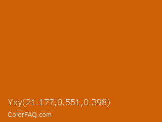 Yxy 21.177,0.551,0.398 Color is a normal orange color and the nearest color is Red Stage #d05f04. Hex code #cd5f06 and RGB value is rgb(205,95,6). In RGB color space, this color is composed of 80% red, 37% green, 2% blue, In CMYK color space, this color is composed of 0% cyan, 54% magenta, 97% yellow , 20% black , In HSL color space, this color has a hue angle of 27° , 94% saturation and 41% lightness.