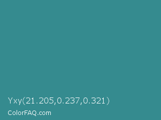 Yxy 21.205,0.237,0.321 Color is a normal cyan color and the nearest color is Lochinvar #2c8c84. Hex code #358b8f and RGB value is rgb(53,139,143). In RGB color space, this color is composed of 21% red, 55% green, 56% blue, In CMYK color space, this color is composed of 63% cyan, 3% magenta, 0% yellow , 44% black , In HSL color space, this color has a hue angle of 183° , 46% saturation and 38% lightness.