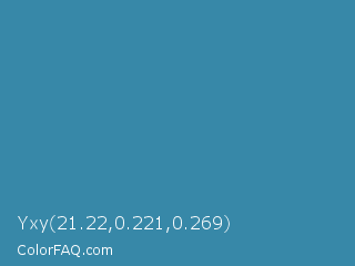 Yxy 21.22,0.221,0.269 Color is a normal blue color and the nearest color is Astral #327da0. Hex code #3788a8 and RGB value is rgb(55,136,168). In RGB color space, this color is composed of 22% red, 53% green, 66% blue, In CMYK color space, this color is composed of 67% cyan, 19% magenta, 0% yellow , 34% black , In HSL color space, this color has a hue angle of 197° , 51% saturation and 44% lightness.