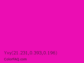 Yxy 21.231,0.393,0.196 Color is a normal magenta color and the nearest color is Shocking Pink #fc0fc0. Hex code #eb0db3 and RGB value is rgb(235,13,179). In RGB color space, this color is composed of 92% red, 5% green, 70% blue, In CMYK color space, this color is composed of 0% cyan, 94% magenta, 24% yellow , 8% black , In HSL color space, this color has a hue angle of 315° , 90% saturation and 49% lightness.