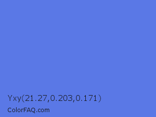 Yxy 21.27,0.203,0.171 Color is a light blue color and the nearest color is Blueberry #4f86f7. Hex code #5a78e6 and RGB value is rgb(90,120,230). In RGB color space, this color is composed of 35% red, 47% green, 90% blue, In CMYK color space, this color is composed of 61% cyan, 48% magenta, 0% yellow , 10% black , In HSL color space, this color has a hue angle of 227° , 74% saturation and 63% lightness.