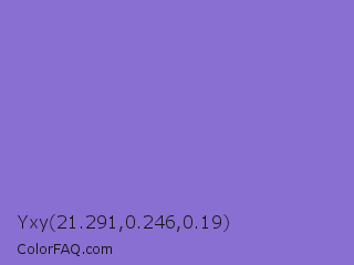 Yxy 21.291,0.246,0.19 Color is a light indigo color and the nearest color is True V #8a73d6. Hex code #896fd1 and RGB value is rgb(137,111,209). In RGB color space, this color is composed of 54% red, 44% green, 82% blue, In CMYK color space, this color is composed of 34% cyan, 47% magenta, 0% yellow , 18% black , In HSL color space, this color has a hue angle of 256° , 52% saturation and 63% lightness.