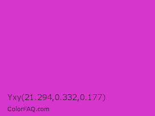 Yxy 21.294,0.332,0.177 Color is a normal magenta color and the nearest color is Steel Pink #cc33cc. Hex code #d636cc and RGB value is rgb(214,54,204). In RGB color space, this color is composed of 84% red, 21% green, 80% blue, In CMYK color space, this color is composed of 0% cyan, 75% magenta, 5% yellow , 16% black , In HSL color space, this color has a hue angle of 304° , 66% saturation and 53% lightness.