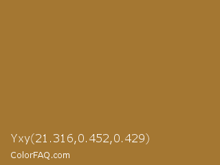 Yxy 21.316,0.452,0.429 Color is a normal orange color and the nearest color is Metallic Sunburst #9c7c38. Hex code #a47732 and RGB value is rgb(164,119,50). In RGB color space, this color is composed of 64% red, 47% green, 20% blue, In CMYK color space, this color is composed of 0% cyan, 27% magenta, 70% yellow , 36% black , In HSL color space, this color has a hue angle of 36° , 53% saturation and 42% lightness.