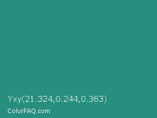Yxy 21.324,0.244,0.363 Color is a normal cyan color and the nearest color is Lochinvar #2c8c84. Hex code #288e7e and RGB value is rgb(40,142,126). In RGB color space, this color is composed of 16% red, 56% green, 49% blue, In CMYK color space, this color is composed of 72% cyan, 0% magenta, 11% yellow , 44% black , In HSL color space, this color has a hue angle of 171° , 56% saturation and 36% lightness.
