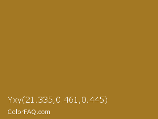 Yxy 21.335,0.461,0.445 Color is a normal orange color and the nearest color is Mandalay #ad781b. Hex code #a37823 and RGB value is rgb(163,120,35). In RGB color space, this color is composed of 64% red, 47% green, 14% blue, In CMYK color space, this color is composed of 0% cyan, 26% magenta, 79% yellow , 36% black , In HSL color space, this color has a hue angle of 40° , 65% saturation and 39% lightness.