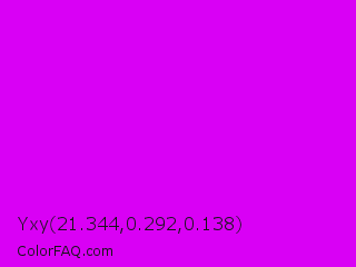 Yxy 21.344,0.292,0.138 Color is a normal magenta color and the nearest color is Phlox #df00ff. Hex code #d900f5 and RGB value is rgb(217,0,245). In RGB color space, this color is composed of 85% red, 0% green, 96% blue, In CMYK color space, this color is composed of 11% cyan, 100% magenta, 0% yellow , 4% black , In HSL color space, this color has a hue angle of 293° , 100% saturation and 48% lightness.