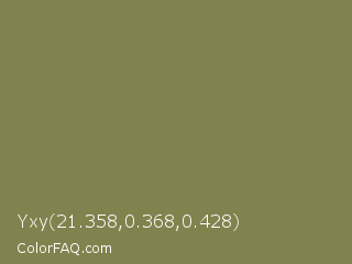 Yxy 21.358,0.368,0.428 Color is a normal yellow color and the nearest color is Gold Fusion #85754e. Hex code #80834d and RGB value is rgb(128,131,77). In RGB color space, this color is composed of 50% red, 51% green, 30% blue, In CMYK color space, this color is composed of 2% cyan, 0% magenta, 41% yellow , 49% black , In HSL color space, this color has a hue angle of 63° , 26% saturation and 41% lightness.