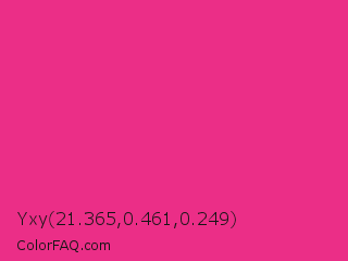 Yxy 21.365,0.461,0.249 Color is a normal rose color and the nearest color is Cerise Pink #ec3b83. Hex code #eb2e87 and RGB value is rgb(235,46,135). In RGB color space, this color is composed of 92% red, 18% green, 53% blue, In CMYK color space, this color is composed of 0% cyan, 80% magenta, 43% yellow , 8% black , In HSL color space, this color has a hue angle of 332° , 83% saturation and 55% lightness.