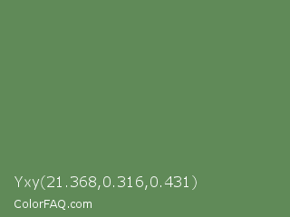 Yxy 21.368,0.316,0.431 Color is a normal green color and the nearest color is Glade Green #61845f. Hex code #608a58 and RGB value is rgb(96,138,88). In RGB color space, this color is composed of 38% red, 54% green, 35% blue, In CMYK color space, this color is composed of 30% cyan, 0% magenta, 36% yellow , 46% black , In HSL color space, this color has a hue angle of 110° , 22% saturation and 44% lightness.